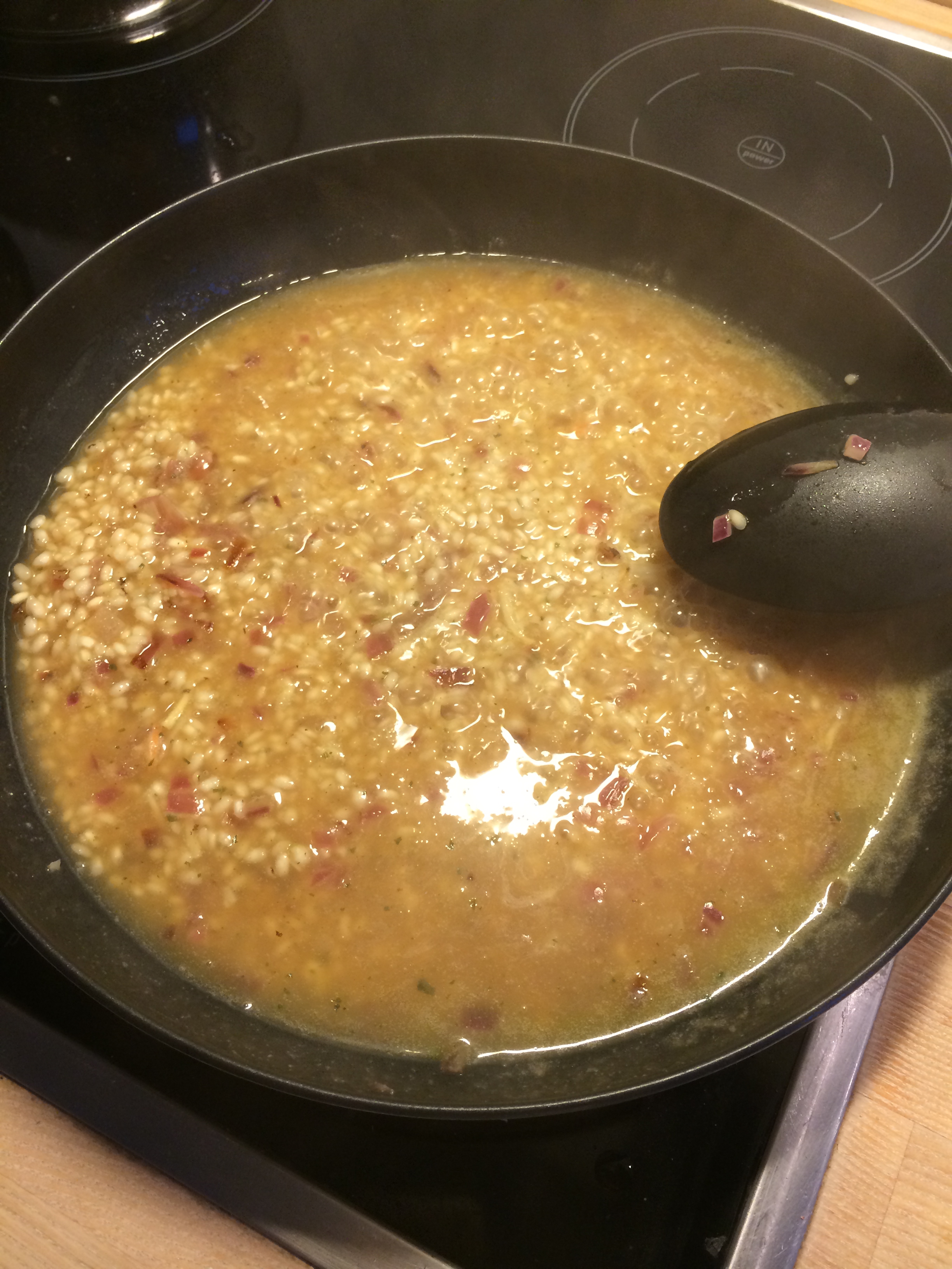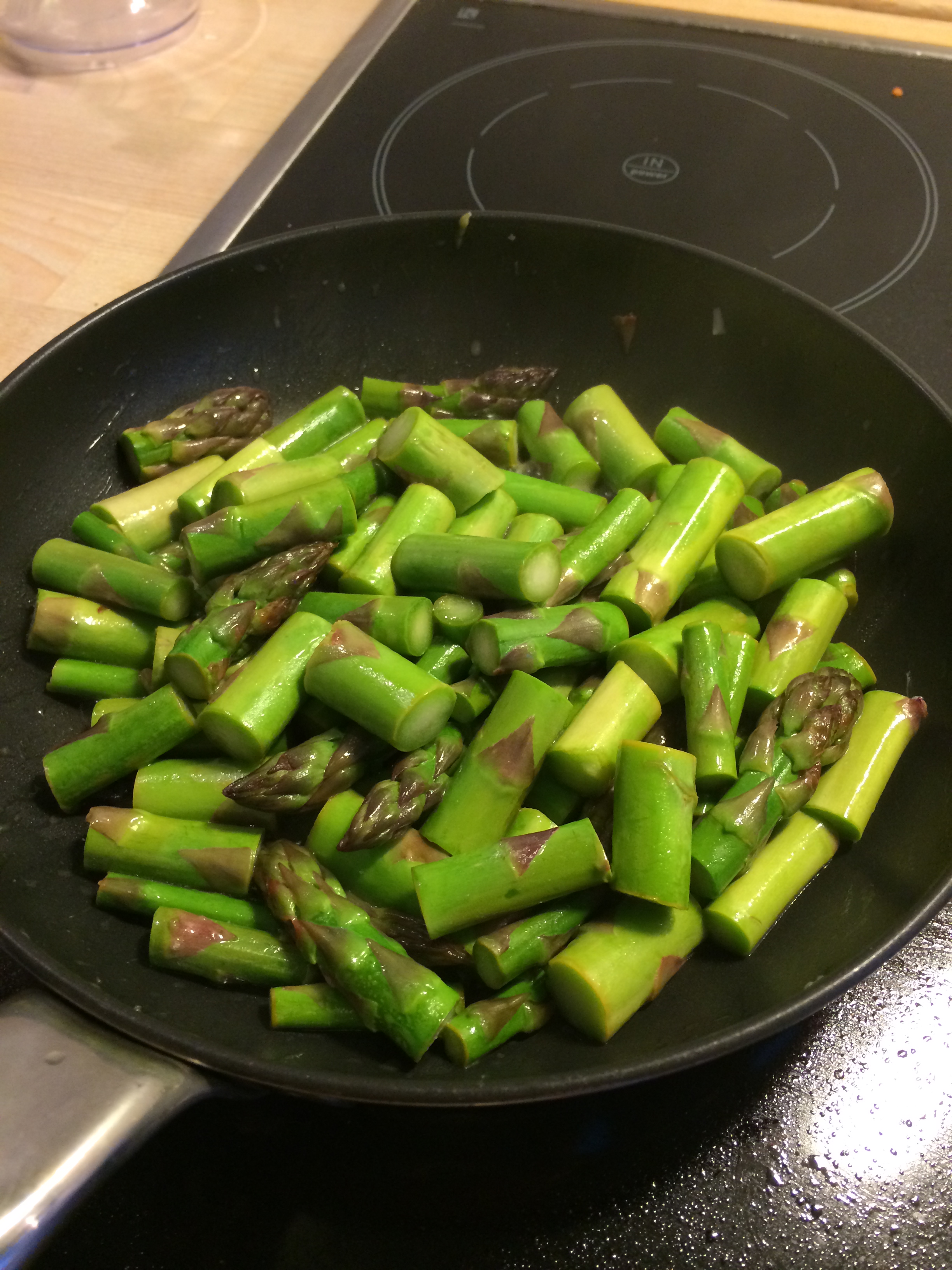 Heat some olive oil or butter in a pan and fry onion dices until translucent. Add ristotto rice and let sear for a couple of seconds. It should not turn brown! Deglaze with the white wine and stir until the wine is almost absorbed. Heat the vegetable broth and slowly add more and more broth to the pan, so the rice is always just covered. Wash the asparagus and break off the stringy ends. Cut into 2-3cm pieces. In a second pan, heat about 1 tbsp olive oil and add the asparagus. Season with salt and squeeze the juice of a half lemon over the asparagus. Let cook for about 5 minutes, stirring frequently. When the risotto has absorbed most of the fluid, add the frozen peas (this will interrupt the cooking process, so make sure the rice is cooked all the way). Let cook another 5 minutes or so, until the peas are cooked. Stir in the parmesan cheese and finally the asparagus pieces. Add some freshly grated parmesan before serving. Enjoy!
