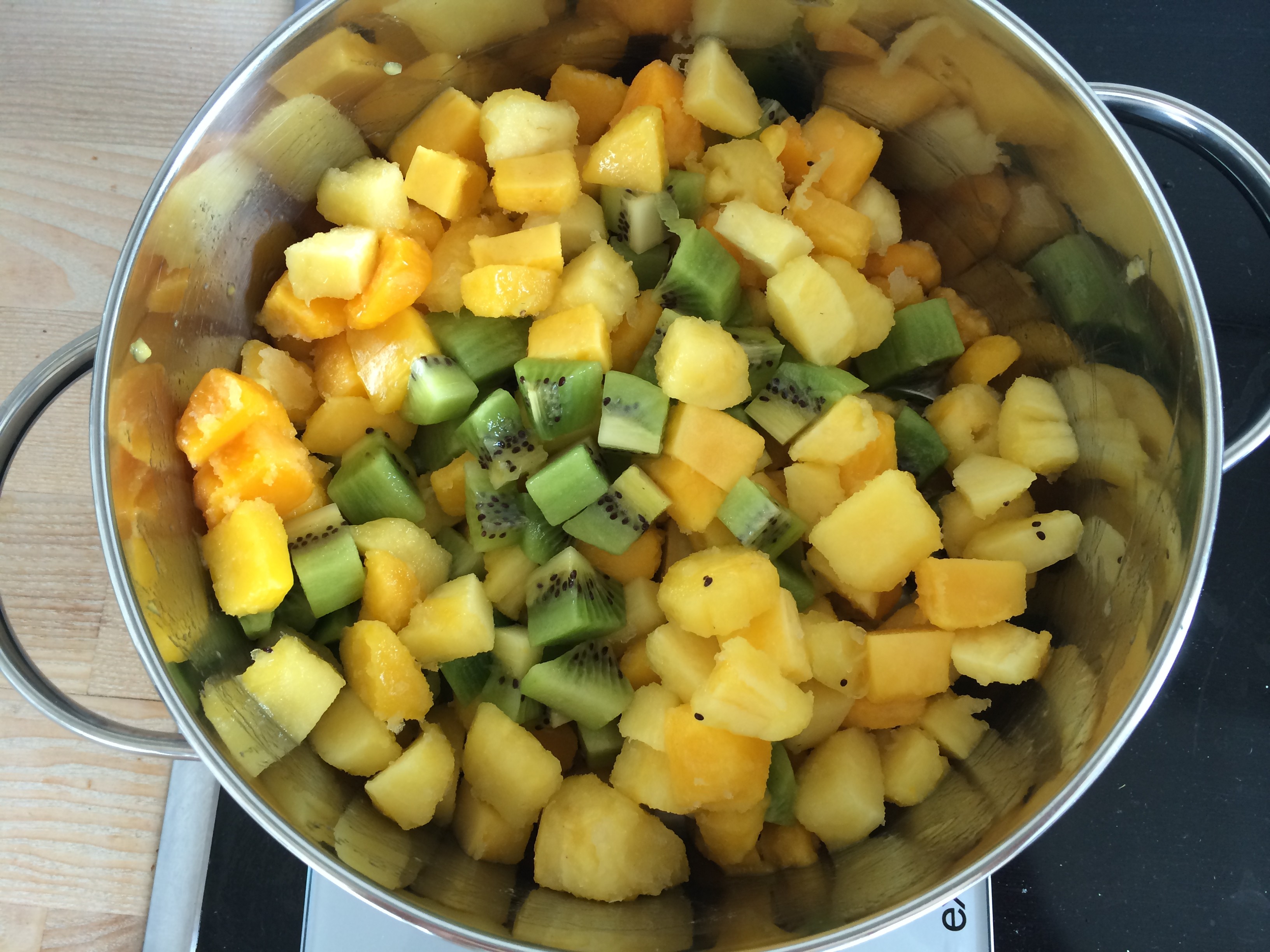 With all that free time on my hands, and inspired by the beautiful weather, I decided it was time to make something again! A nice give-away/ gift for the hosts for the family Easter brunch we’re attending tomorrow. So I decided on a nice jam. My first thought was strawberry-rhubarb (since I still have some rhubarb in the freezer), but I’d rather use fresh rhubarb when it is in season. So I decided on an exotic spring jam with mango, pineapple and kiwi, which turned out quite yummy!