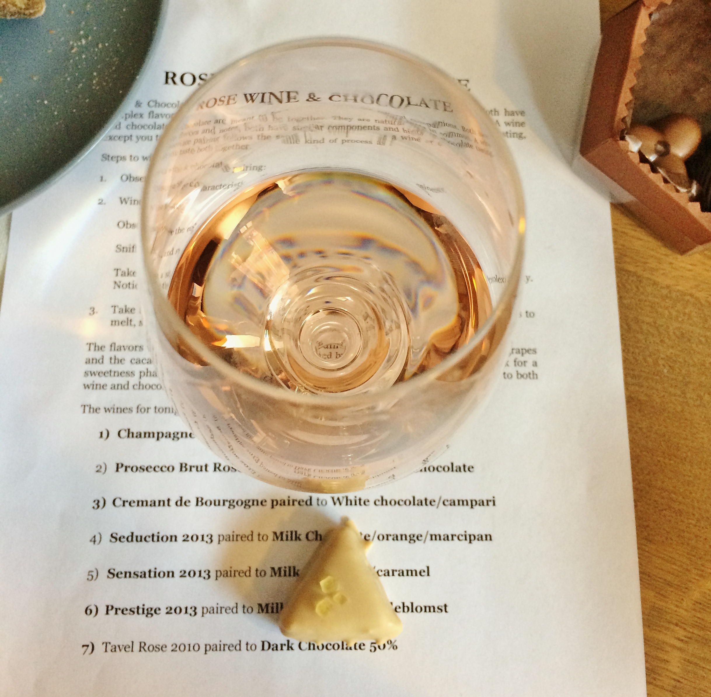 The setup was to taste seven different rosés, three of them sparkling (a champagne, a prosecco and a crémant). To each of the wines, we were to taste a hand-picked and hand-made-for-the-occasion chocolate – some were plain, others were filled, all were delicious! They were made by Chokolade-Hex who really did work some magic! You can also find her on Facebook.