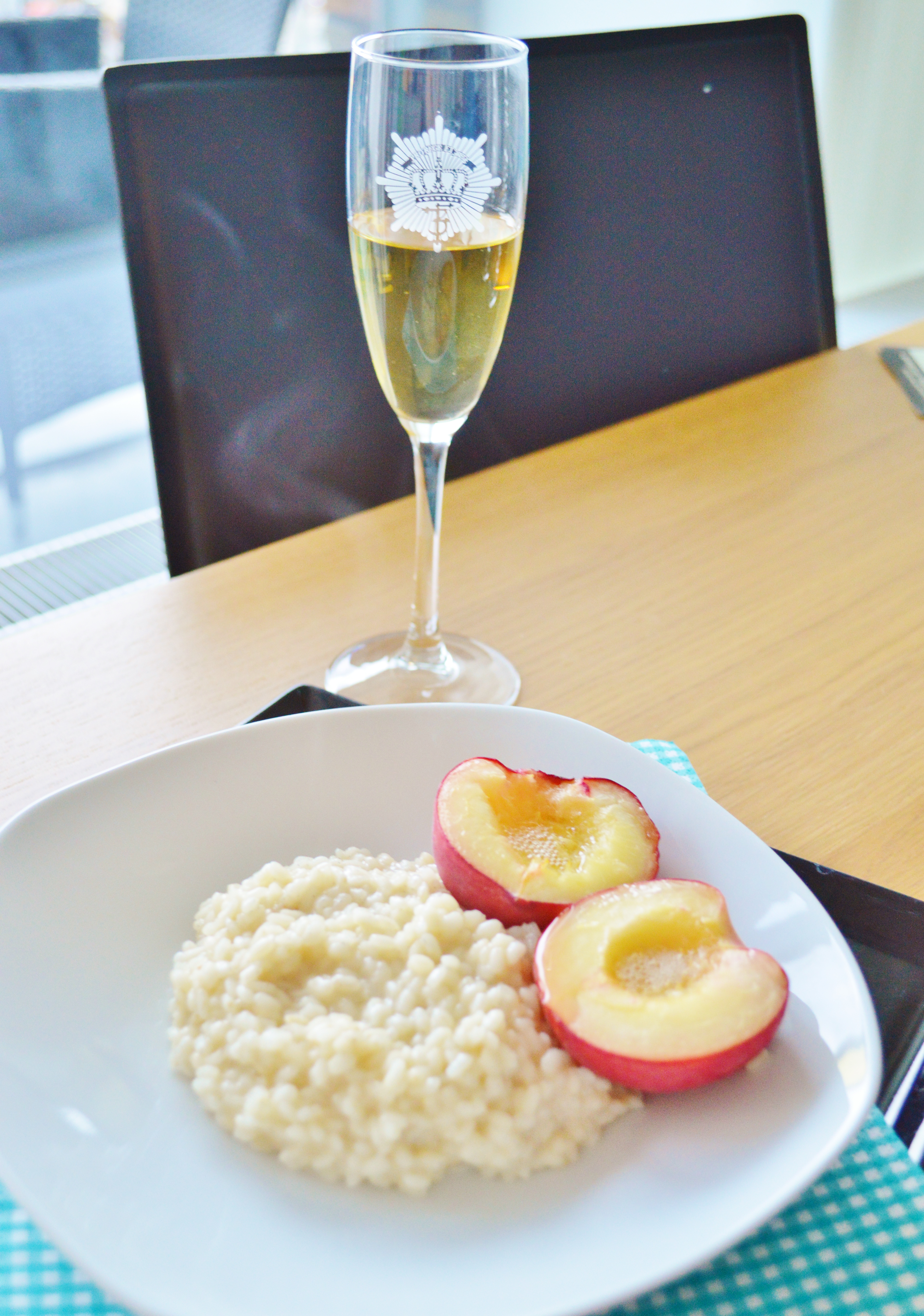 So, in reminiscense of the good ol’ times and the many a great plate of Milchreis, I set out to create a sort of “glorified Milchreis”, which I shall call a sweet risotto. On my search, I came across different recipes using peaches, and I decided to blend them all together to make my own. This is inspired by eatsmarter and Jamie Oliver, and it’s my interpretation of “grown-up Milchreis”. Dessert for dinner – does it get any better? Of course, you could also serve this as an actual dessert, but that’s way less fun, if you ask me!