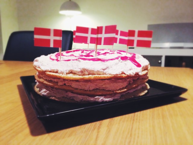 Make sure the “lagkagebunde” are fully cooled off. Add the sugar to the cream and whip until stiff. Add the mascarpone, cinnamon, and some orange zest (about 1 tsp) and stir to combine. Add the cherry sauce and fold in. Squeeze the juice from the orange and mix with the cognac. Moisten the first lagkagebund with about a third of the juice-cognac mix, then spoon on about a third of the cherry cream and distribute evenly. Carefully put the next one on top and softly press down. Repeat the previous steps for the remaining lagkagebunde. Refrigerate for about an hour before serving, and don’t forget to decorate with little Danish flags!
