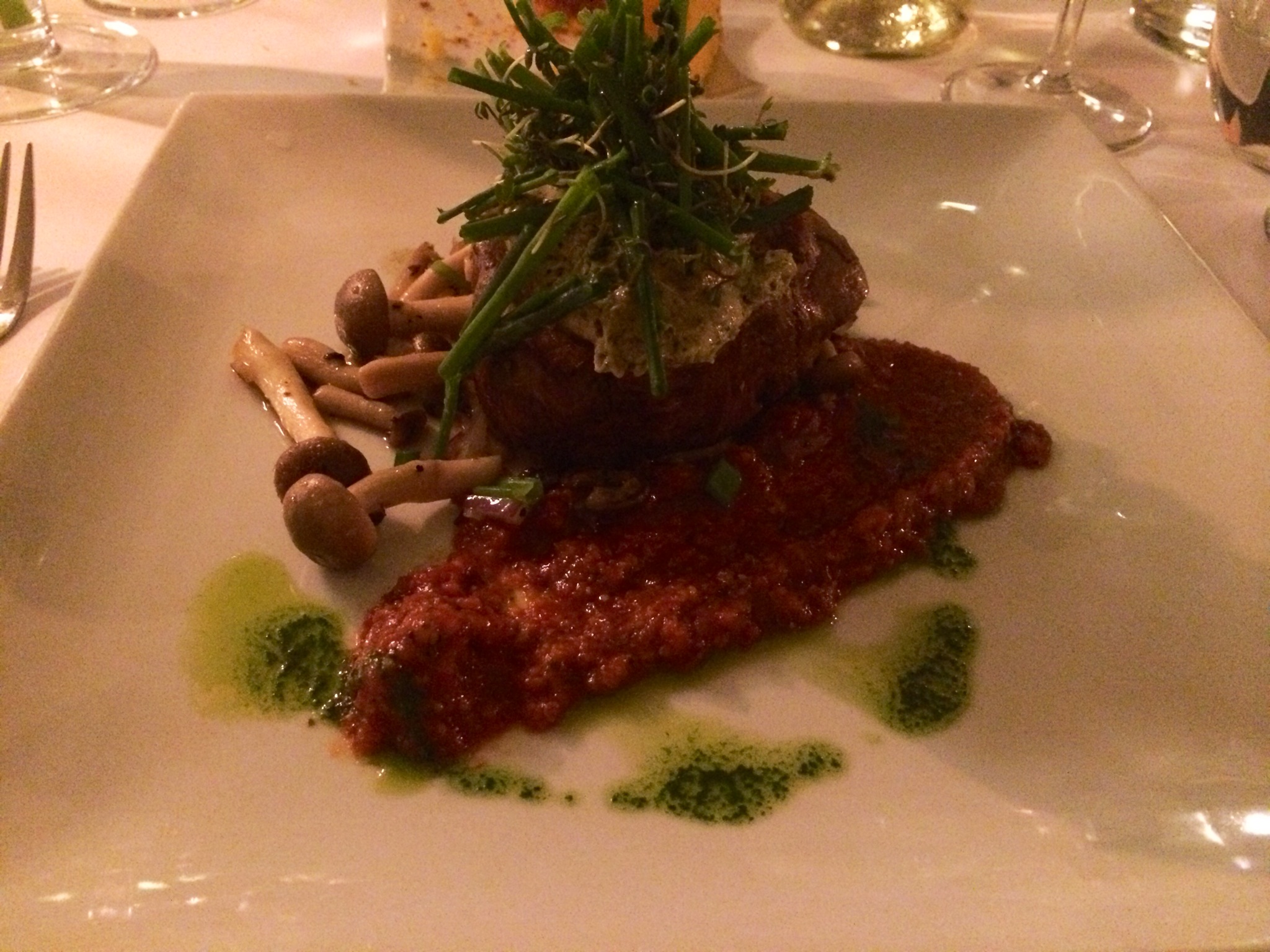 I’m not a big steak person, and when I order something in a restaurant or steak house, I always go with the filet. I’m very picky when it comes to meat, and anything that’s fat or “chewy”, I won’t touch. But this tenderloin – beautiful. Great quality meat, prepared to perfection, cooked medium/ medium-well, just how I like it, juicy and tasty. A spicy tomato paste on the side (probably the sauce amore), and some oven-baked potato wedges with a nice seasoning (assuming this is called pommes du pont, even though I hadn’t heard that before). On top of the meat there was a good chunk of home-made chives butter, which complemented the taste of the meat perfectly. All in all, an amazing course!