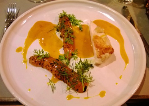 The main course was chicken – before I moved here, I hardly ever got served chicken in a “high end” restaurant, it seems to be too common or beneath most “fine dining” chefs. But I’ve had it twice in really good restaurants in Copenhagen, and both times, it was amazing (the Viking boyfriend to this day says that the chicken breast with rhubarb and sweet corn at Oliver And The Black Circus was the best dish he’s ever eaten at a restaurant – but that restaurant deserves its own post). This chicken breast came with roasted and pureed carrots and fresh herbs, and it was simply delicious!
